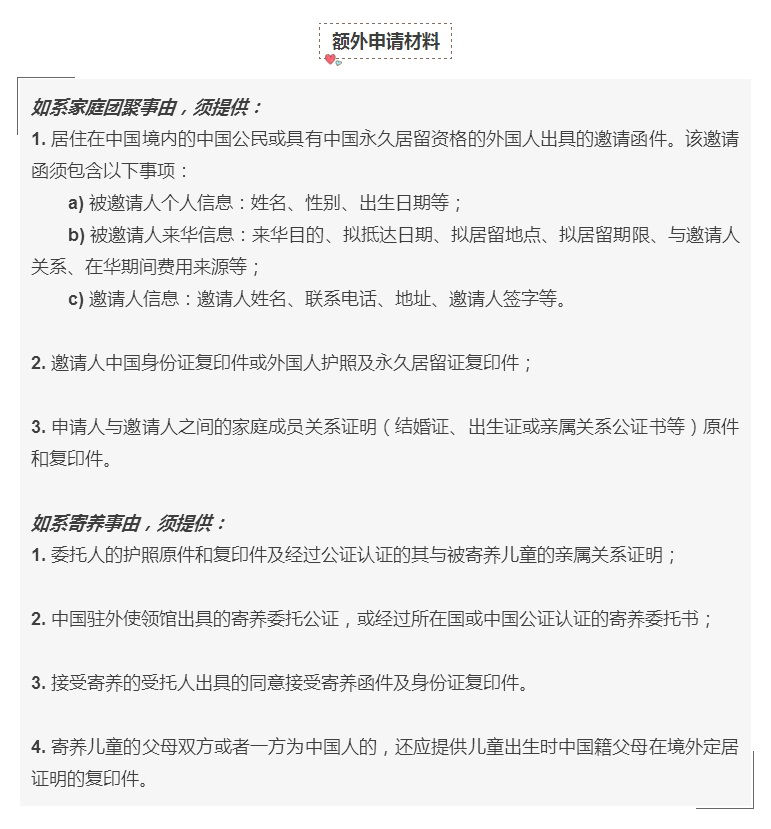 适用人群:因家庭团聚申请赴中国居留的中国公民的家庭成员和具有中国永久居留资格的外国人的家庭成员,以及因寄养等原因申请入境居留的人员。在中国境内停留超过180日。
